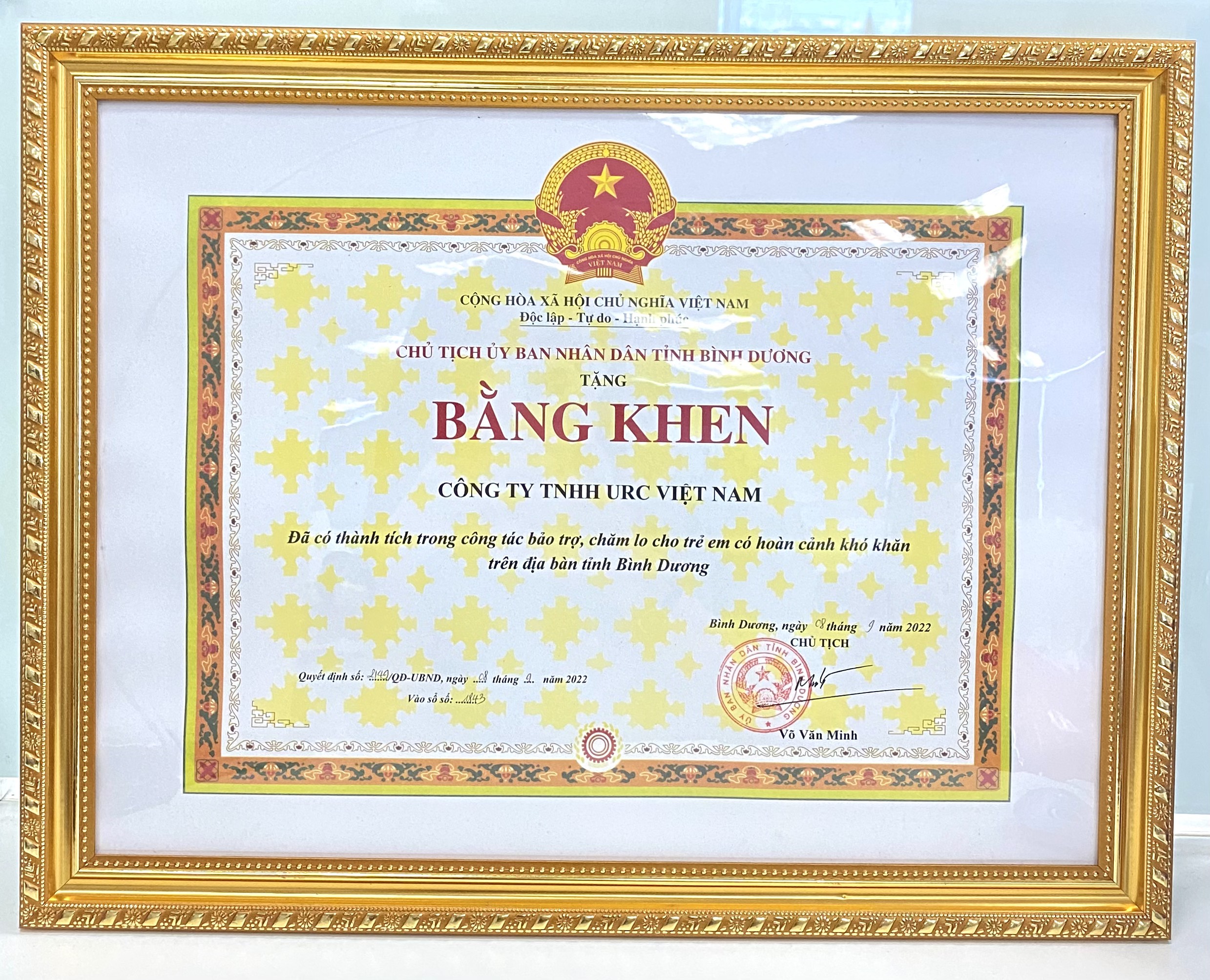 Certificate of Honor from the Chairman of the Binh Duong Provincial People's Committee for our achievements in sponsoring and taking care of disadvantaged children in the province.