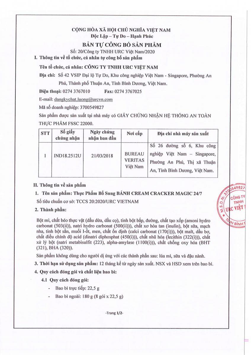Công Bố Sản Phẩm Mới Thực phẩm Bổ Sung BÁNH CREAM CRACKER MAGIC 24/7