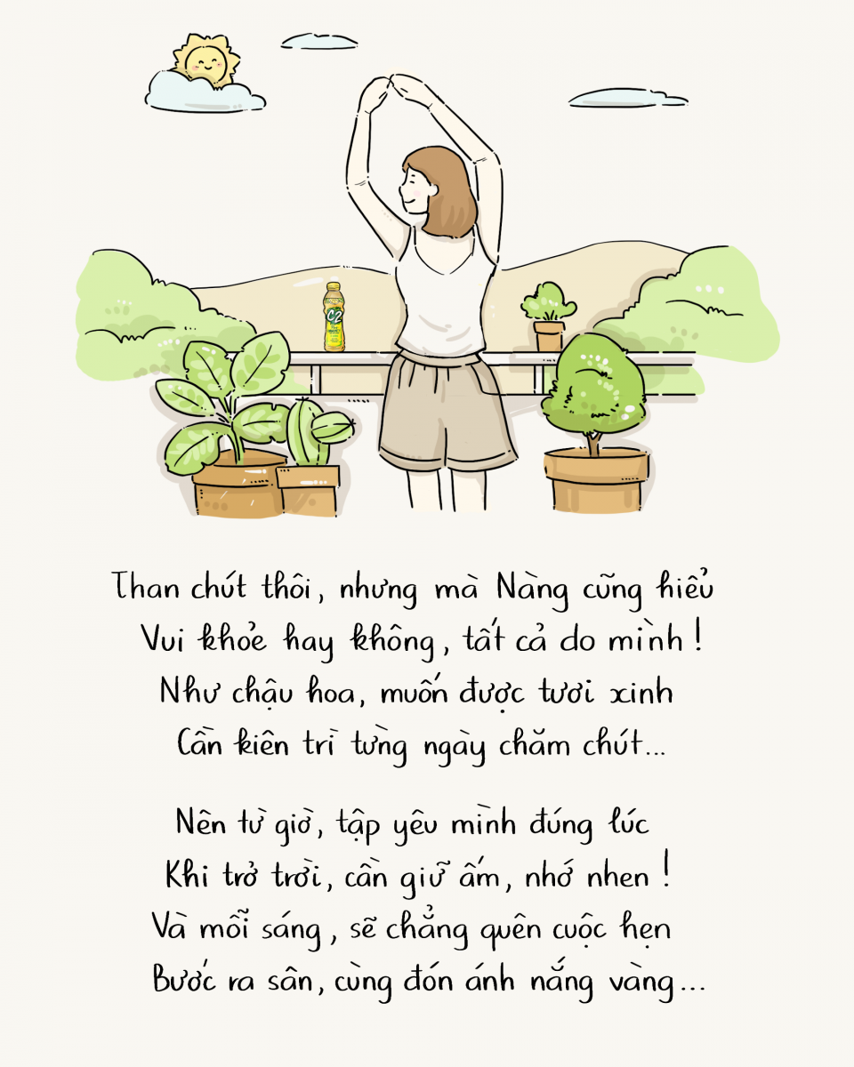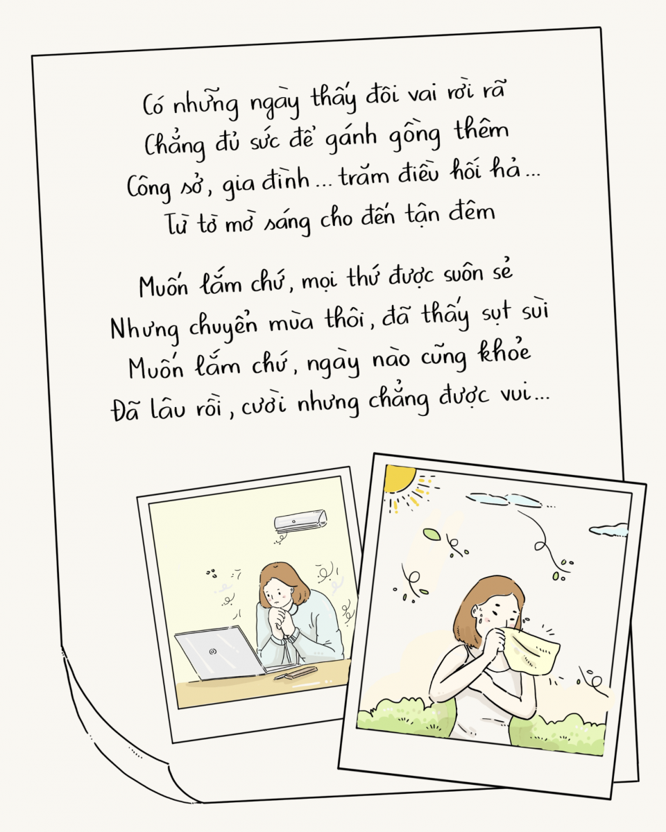 Cả một series tranh-thơ là bức chân dung về cô gái “nghiện việc” chính hiệu: từ sự mệt mỏi với deadline chồng chất, bệnh vặt do bỏ bê việc chăm sóc sức khỏe bản thân, ý muốn bỏ cuộc nhưng cuối cùng đã mạnh mẽ lấy lại cân bằng. Đánh thức cả một thế hệ đang trải qua nhiều bất ổn, rằng hãy yêu bản thân và chăm sóc sức khoẻ của chính mình.