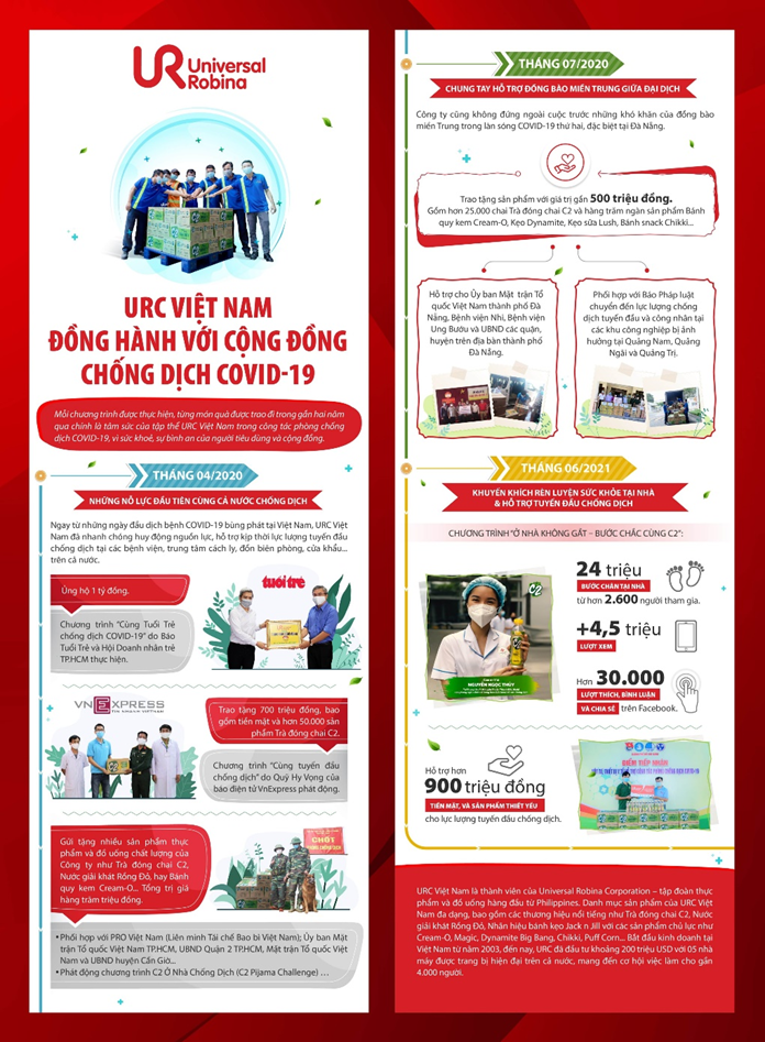 URC Việt Nam luôn là một doanh nghiệp tích cực trong công tác ủng hộ chống dịch Covid-19. Điểm nhanh, từ tháng 4/2020, URC Việt Nam đã quyên góp 1 tỷ đồng cho chương trình "Cùng Tuổi trẻ chống Covid-19”, trao tặng 700 triệu đồng, bao gồm tiền mặt và hơn 50.000 sản phẩm Trà đóng chai C2 thông qua chương trình “Cùng tuyến đầu chống dịch” do Quỹ Hy Vọng của báo điện tử VnExpress phát động.