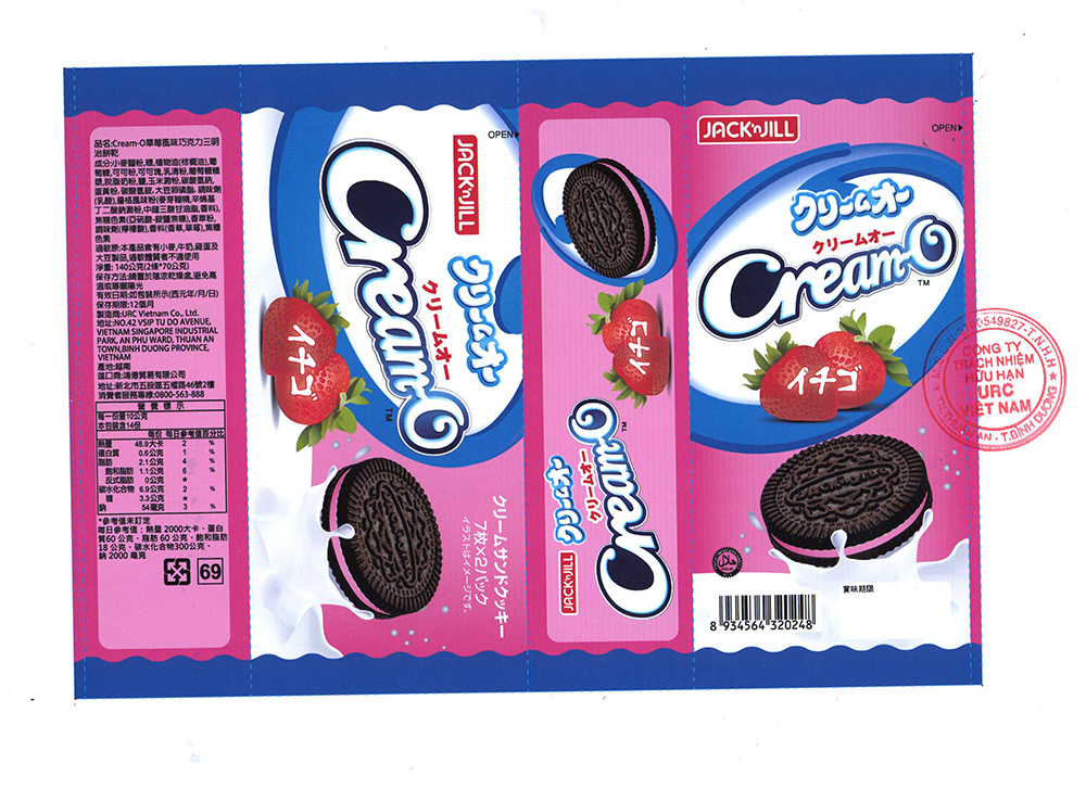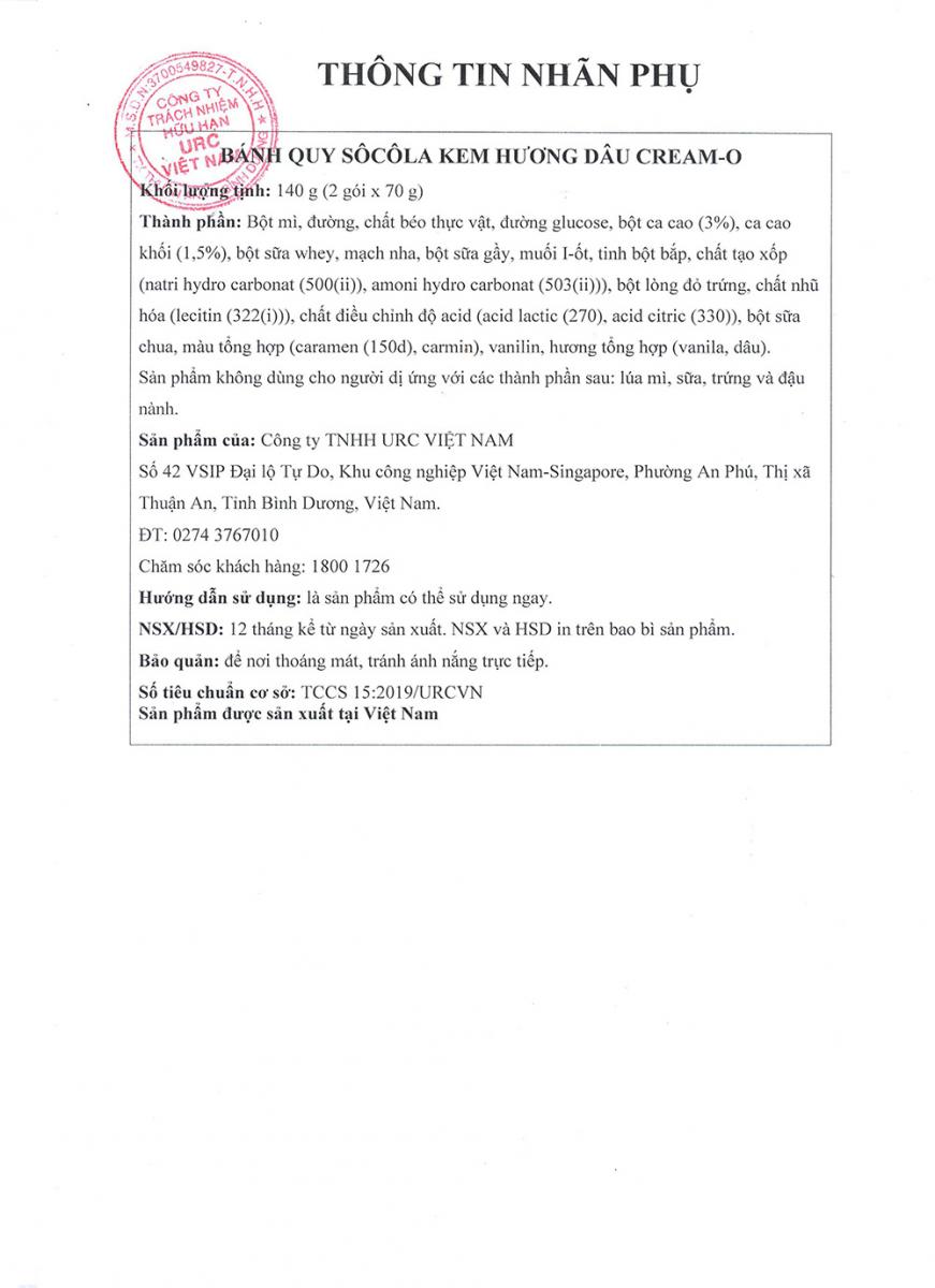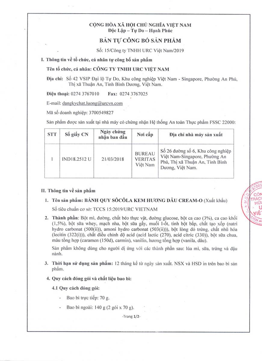 TỰ CÔNG BỐ SẢN PHẨM: BÁNH QUY SÔCÔLA KEM HƯƠNG DÂU CREAM-O (Xuất khẩu)